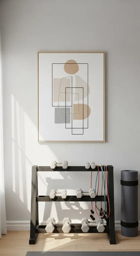Geometric abstract prints introduce structure and rhythm to a home gym wall. Minimal designs maintain calmness while adding a sense of style and sophistication to the workout environment.