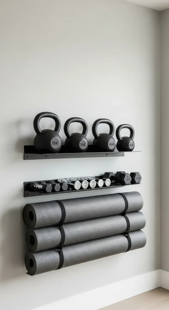 Shelves designed for small equipment double as functional decor. Neatly displaying kettlebells, dumbbells, or yoga mats makes the space feel organized and professional.