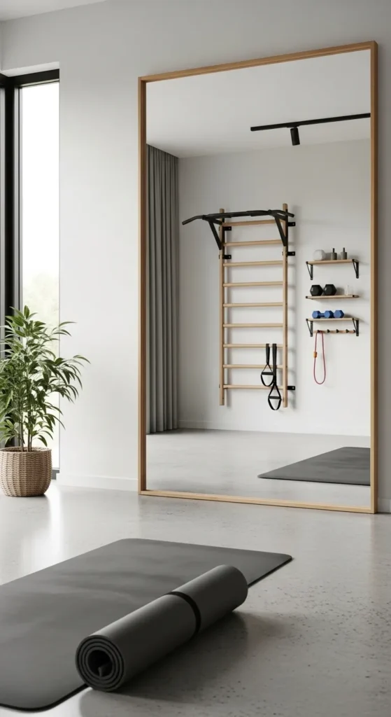 A full-length mirror can run along one wall or be segmented into panels. It not only enhances functionality but also adds a sleek, modern aesthetic. Seeing your movements reflected can be motivating and help you stay consistent with your workouts.