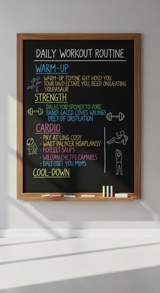 Mount it at a height visible from your exercise space. Use colorful chalk to differentiate exercises, reps, or days, creating a visually engaging and motivating display that refreshes each session.
