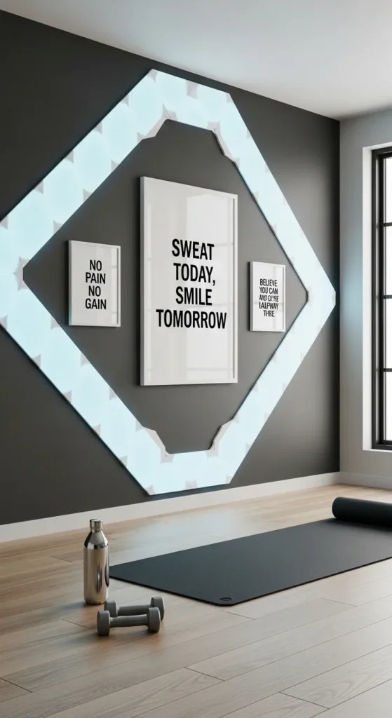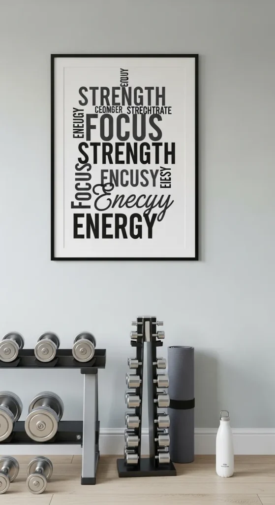 Creating a word collage from inspiring terms adds personality and focus to your gym wall. Words like “Endurance,” “Balance,” and “Power” can set the tone for each session.