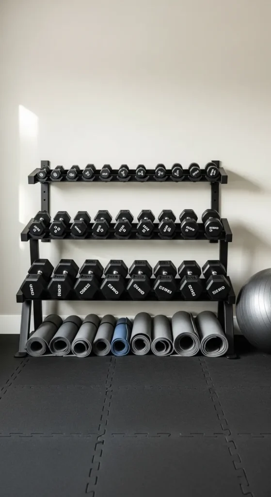 Choose a rack that matches the room’s style—metal for a modern feel or wood for warmth. Mount it at a convenient height and arrange dumbbells by size or weight for a visually appealing, accessible setup.