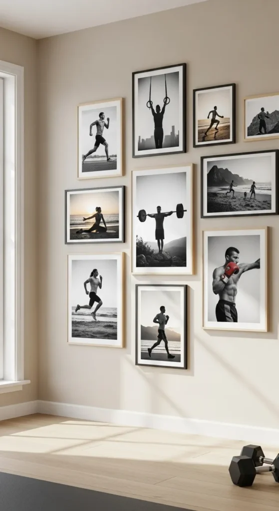 Use matching frames or canvas panels to maintain a cohesive look. Hang them at eye level or stagger along the wall to create rhythm, making the space feel more energetic and motivating.