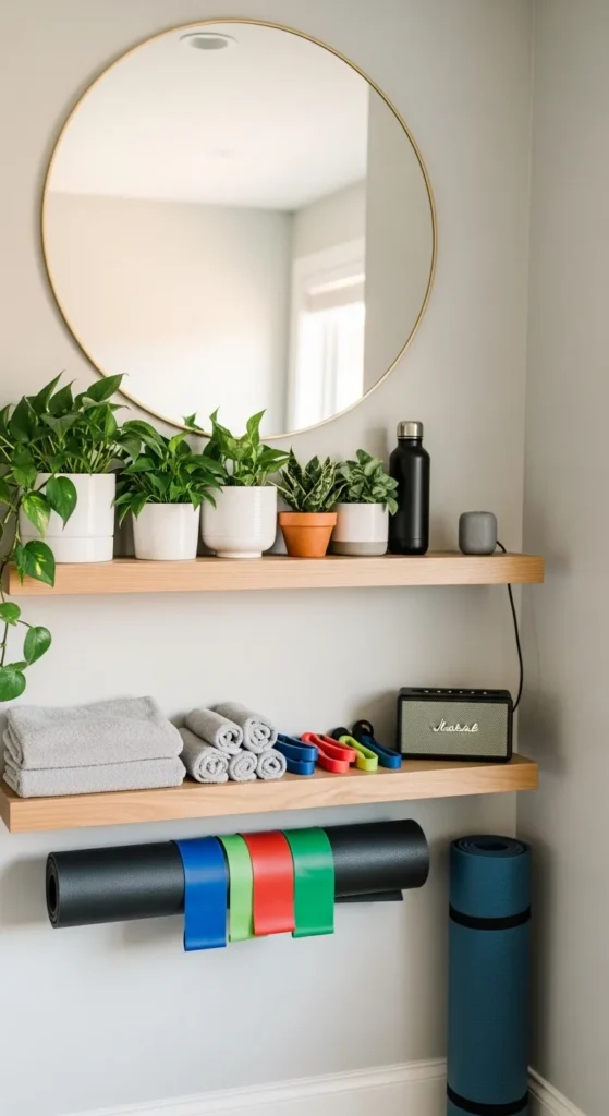 Floating shelves add both storage and decorative interest to a home gym. You can display water bottles, towels, small weights, or plants while keeping the floor space open.