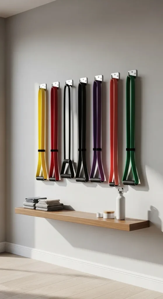 Wall-mounted organizers for resistance bands or yoga straps keep equipment accessible while doubling as functional wall decor. An organized display encourages consistent use and reinforces a clean, focused environment.