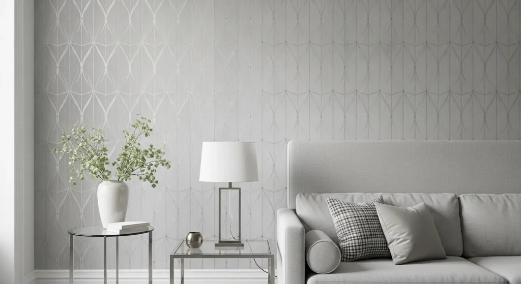 This wallpaper blends seamlessly with modern furniture and metallic decor. Silver or chrome accents complement the grey tones, enhancing the Deco aesthetic. It’s a versatile option that works in living rooms, bedrooms, or even offices.