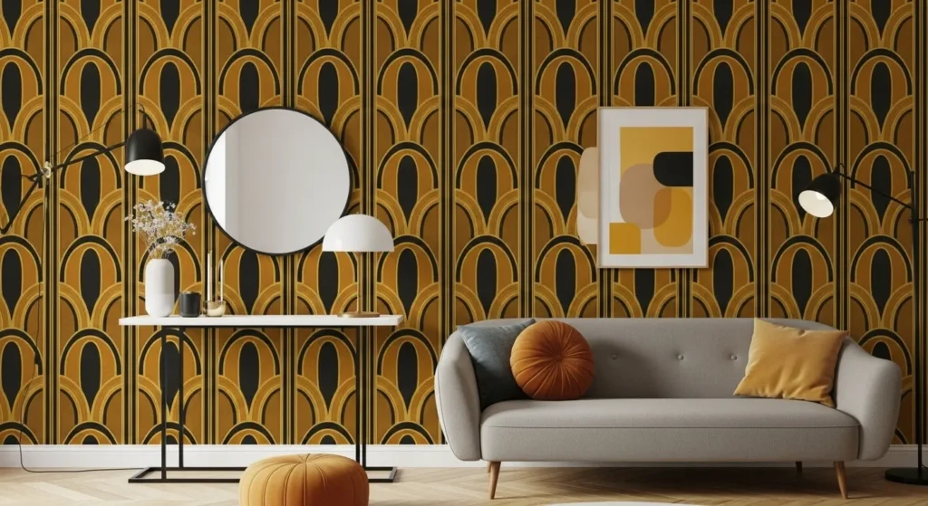 Mustard yellow paired with black creates a bold, retro-forward Art Deco look. The arch patterns add height and movement, making walls feel dynamic and expressive. This design feels playful yet grounded in classic geometry.