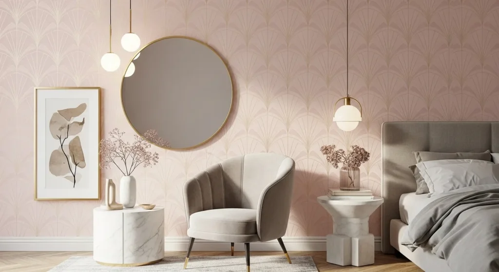 For a softer take on Art Deco, blush tones combined with subtle brass detailing offer vintage charm without overwhelming the space. Repeating arch patterns create upward movement, visually elongating walls and adding a sense of height. This is particularly effective in bedrooms or small living rooms where you want elegance without heaviness.