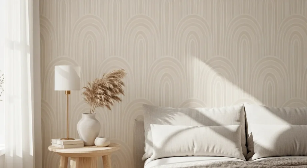 Pair with wooden furniture and cream or white textiles to keep the room warm and inviting. Minimal accessories ensure the wallpaper remains the focal point. Soft beige arches provide a timeless backdrop suitable for bedrooms, living rooms, or hallways.