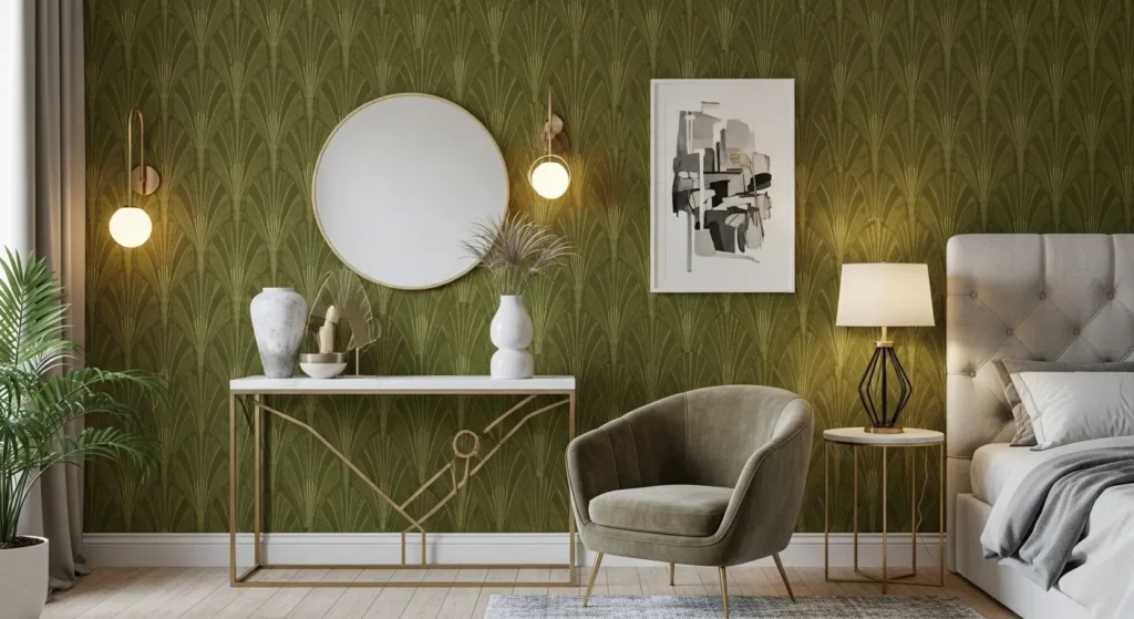 Pair with wood furniture, brass accents, and neutral textiles for a balanced look. Olive tones are versatile, allowing the space to feel both vintage and modern. Fan motifs in green create an elegant, Pinterest-ready focal wall.