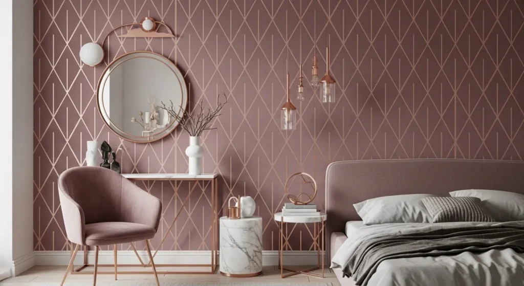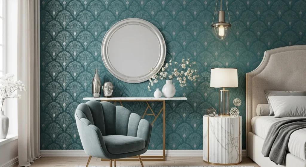 Balance this bold wallpaper with wood furniture and minimal decor to prevent visual overload. Copper light fixtures enhance the metallic elements, creating depth and warmth. Teal and copper together deliver a nostalgic yet refreshed take on Deco style that feels curated rather than overwhelming.