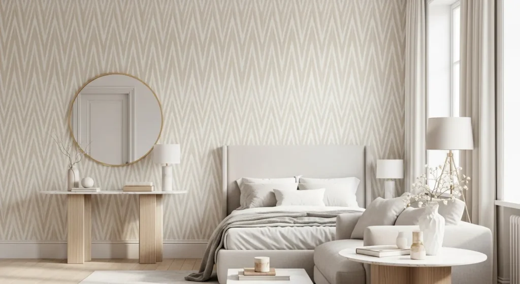 Champagne and cream chevron patterns offer understated luxury for hallways or transitional spaces. The soft palette keeps areas light, while metallic detailing reflects light, enhancing depth and openness. Chevron repetition creates rhythm, giving walls a structured yet elegant feel.