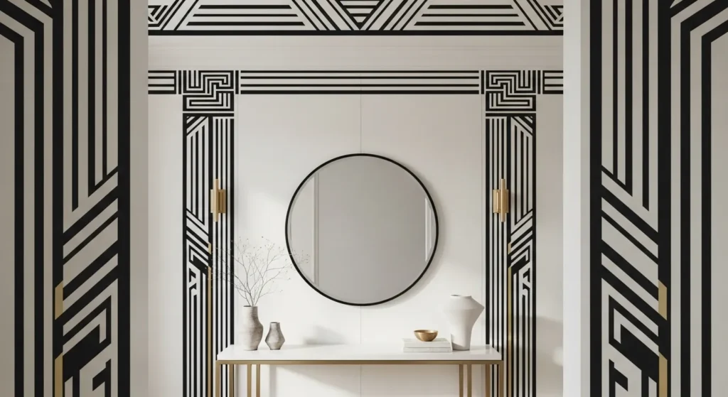 Cream and gold linear patterns bring understated Art Deco glamour into lighter interiors. Instead of heavy jewel tones, this approach relies on subtle contrast and metallic detailing to create depth. Vertical or diagonal lines help elongate walls, making narrow spaces like hallways appear taller and more open.