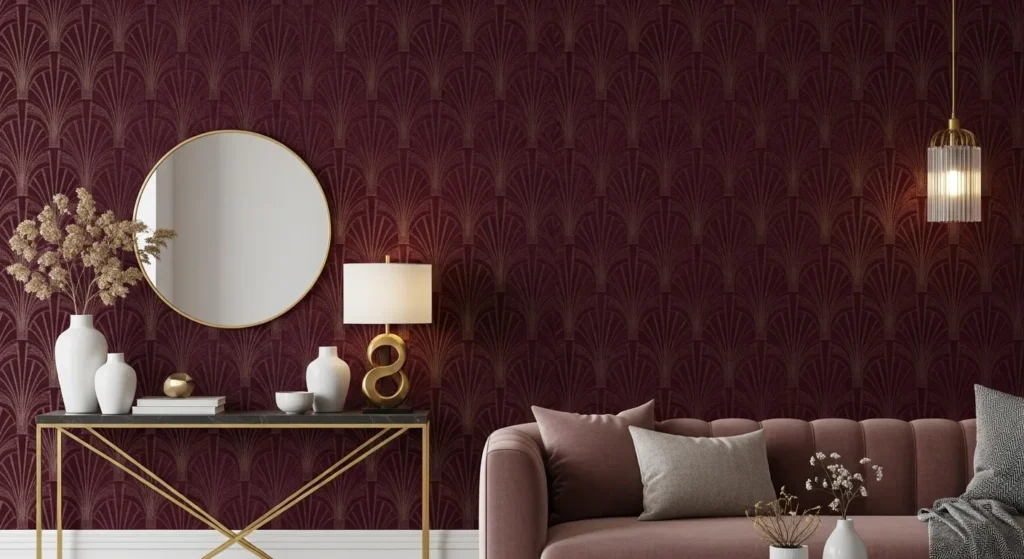 Burgundy fan-pattern wallpaper delivers dramatic richness and vintage romance. The deep tone evokes classic jazz-age interiors, while repeating fan shapes maintain structured elegance. This design works particularly well in dining rooms or intimate spaces.