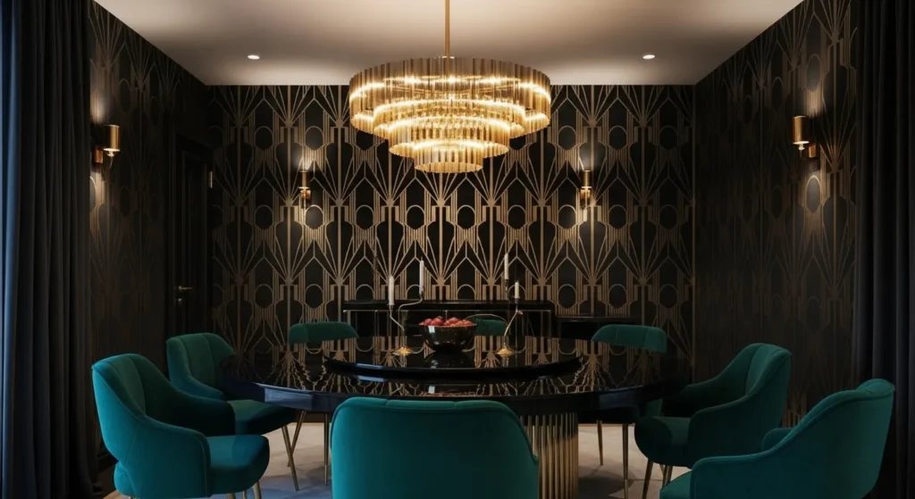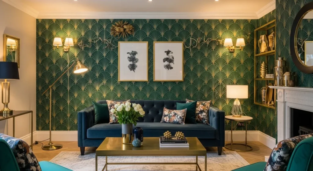 Emerald green paired with metallic gold instantly captures the glamour of the 1920s. A repeating fan motif, one of the most recognizable Art Deco patterns, creates a rhythmic and symmetrical design that feels both dramatic and structured. The deep jewel tone adds richness to the walls while the gold detailing reflects light, making the space feel luminous rather than heavy. This combination works especially well as a statement wall behind a sofa or bed.