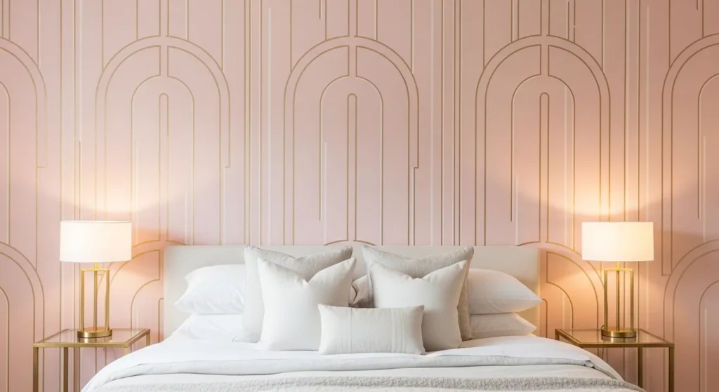 For a softer take on Art Deco, blush tones combined with subtle brass detailing offer vintage charm without overwhelming the space. Repeating arch patterns create upward movement, visually elongating walls and adding a sense of height. This is particularly effective in bedrooms or small living rooms where you want elegance without heaviness.