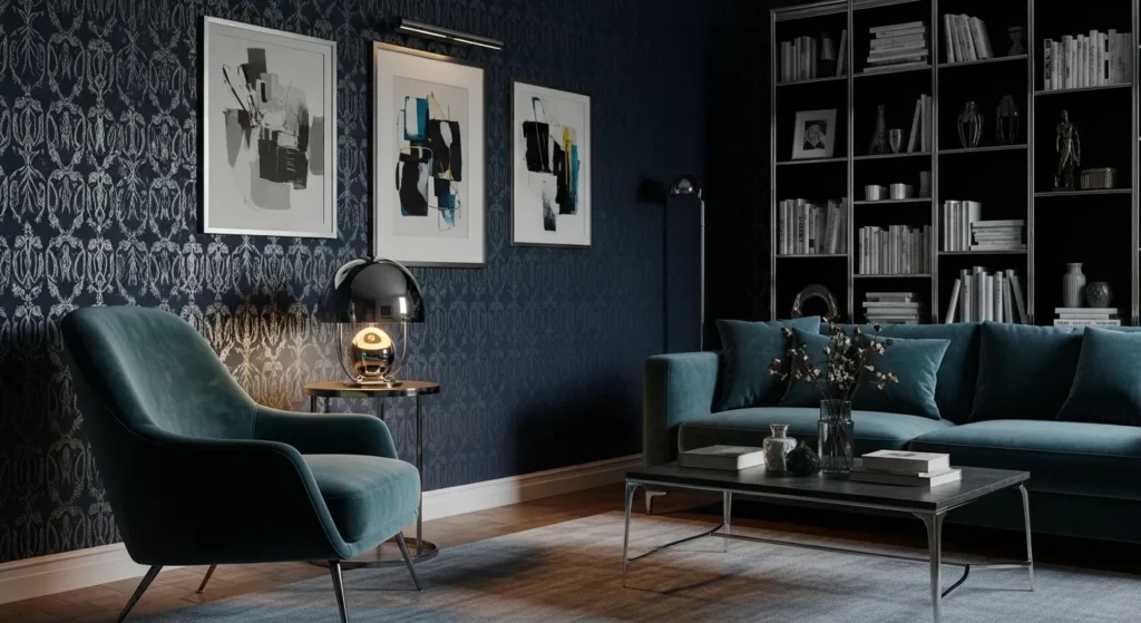 This wallpaper works well in living rooms, libraries, or home offices. Pair it with chrome, glass, or mirrored furniture for an authentic vintage look. To prevent the room from feeling dark, incorporate layered lighting and lighter textiles. Navy and silver offer bold elegance without feeling dated, making it a powerful vintage revival choice.