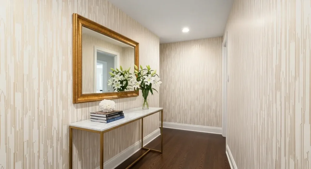 Cream and gold linear patterns bring understated Art Deco glamour into lighter interiors. Instead of heavy jewel tones, this approach relies on subtle contrast and metallic detailing to create depth. Vertical or diagonal lines help elongate walls, making narrow spaces like hallways appear taller and more open.