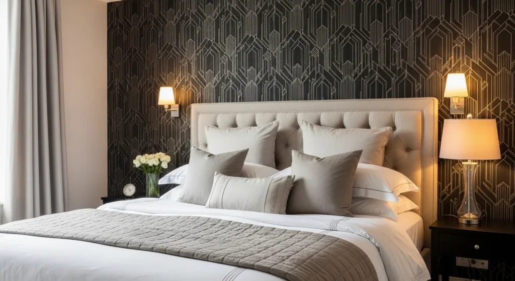 This style pairs beautifully with plush fabrics, layered bedding, and warm-toned lighting. Use it as a feature wall behind a bed or sofa to anchor the space. Charcoal and champagne create a luxurious atmosphere that feels refined and grown-up without leaning too dark.