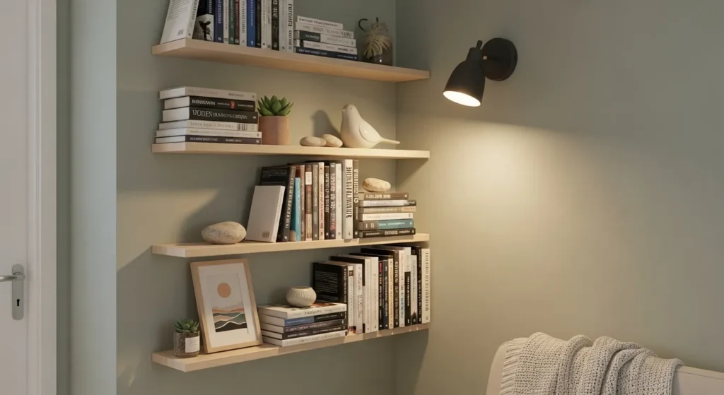 Floating book ledges store books or small decor items while keeping surfaces clear. They’re ideal for vertical storage in tiny apartments.