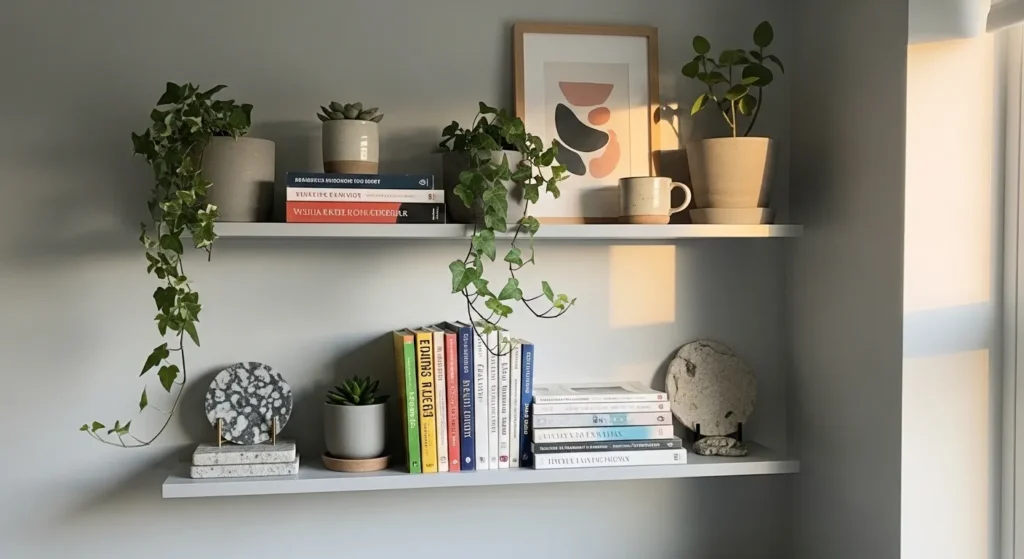 Layer different heights and textures for visual interest. Floating shelves combine function and style, perfect for tiny apartments that need Pinterest-worthy decor.