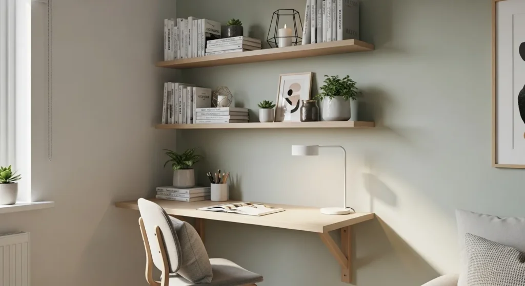 Floating shelves provide storage and display space without taking up floor area. Place plants, books, or decorative objects on slim shelves for a curated look.