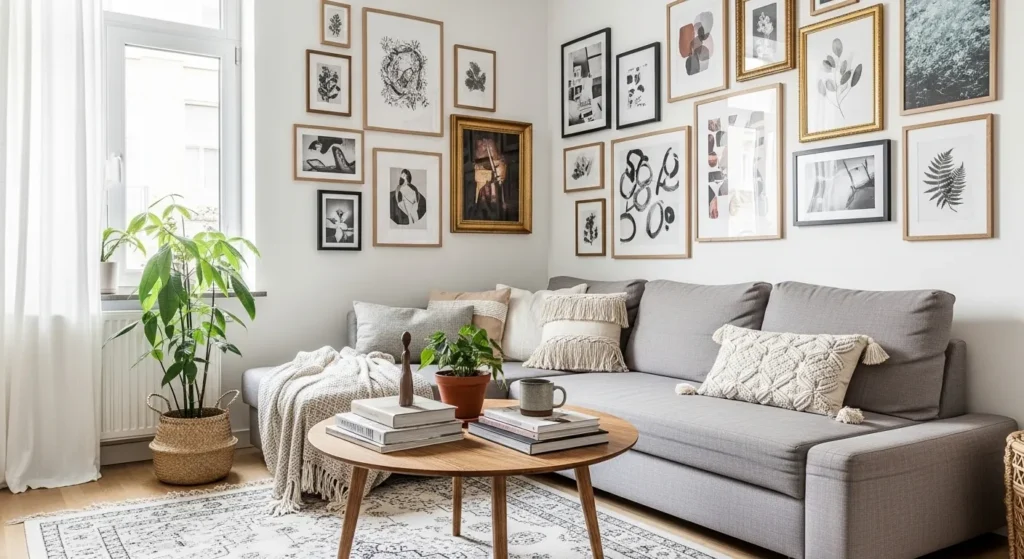 Mix sizes, textures, and colors to create a cohesive look. This technique adds personality and keeps walls Pinterest-ready, even in compact apartments.