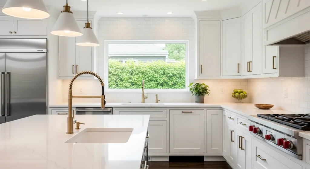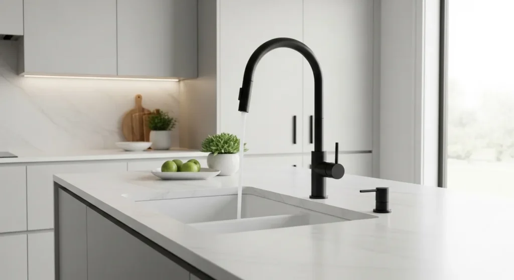 Pair the faucet with neutral sinks and countertops for maximum impact. A stylish faucet becomes a focal point, demonstrating that small details can make a kitchen look high-end on a budget.