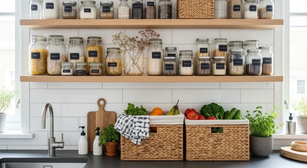 This inexpensive upgrade maximizes vertical space while providing easy access to essentials. Consistency in containers and styling ensures a polished, intentional look, making the kitchen appear more expensive than it is.