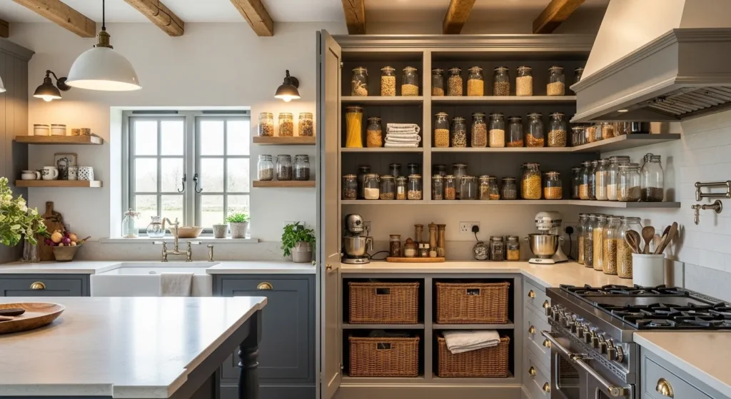Converting a section of the kitchen into an open pantry wall adds both style and function. Displaying ingredients in clear jars and coordinated containers gives the space a curated, high-end feel.