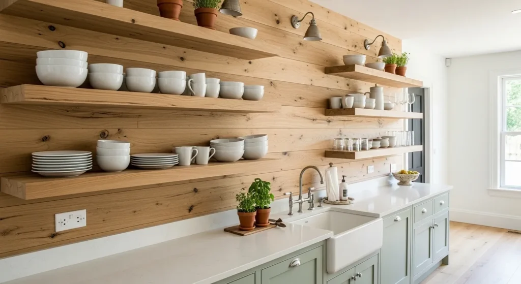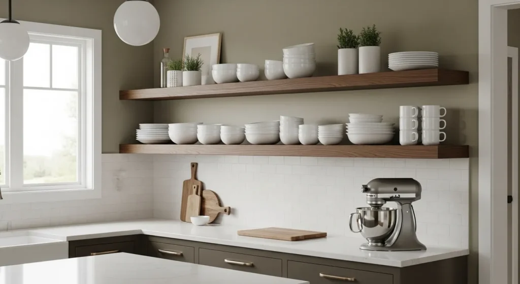 Open shelving adds a sense of airiness and showcases decorative dishware or glassware, giving the kitchen a curated, high-end feel. It’s a simple alternative to installing expensive upper cabinets.