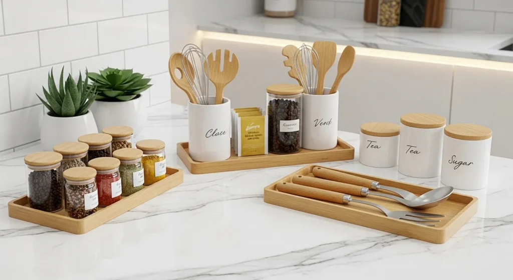 Decorative trays and canisters organize essentials while enhancing visual appeal. Coordinated accessories instantly make the kitchen feel intentional and expensive.
