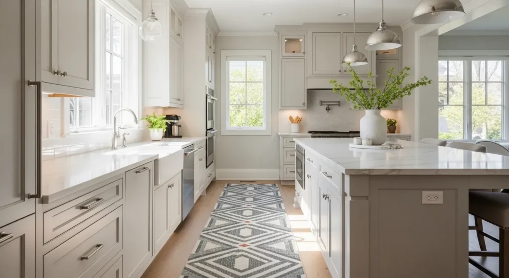 A well-chosen rug brings warmth, texture, and visual interest to the kitchen. Opt for patterns and colors that complement cabinetry and countertops to create a designer-inspired vibe.