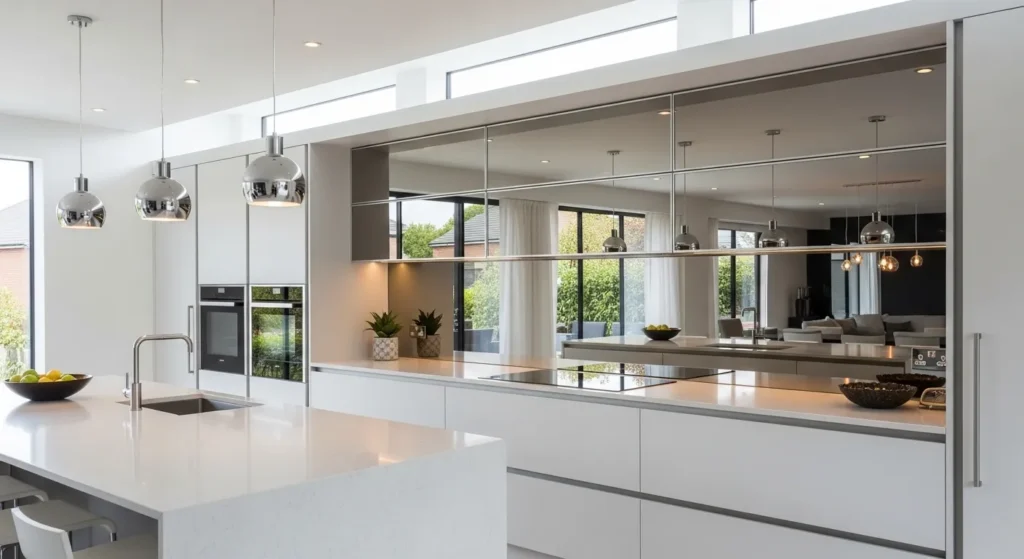 Mirrors or glossy surfaces reflect light, making the kitchen feel larger and more luxurious. Using mirrored tiles, cabinet inserts, or glossy finishes adds depth and a sense of sophistication.