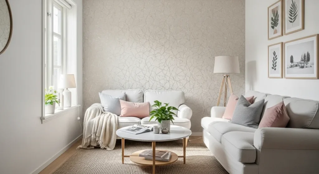 Pair with light furniture and minimal decor to enhance the spacious effect. Textured wallpaper works well on all walls or as an accent wall to create visual interest without crowding the space. The combination of light color and subtle texture tricks the eye into perceiving both height and width, making compact rooms feel more inviting, elegant, and stylish.