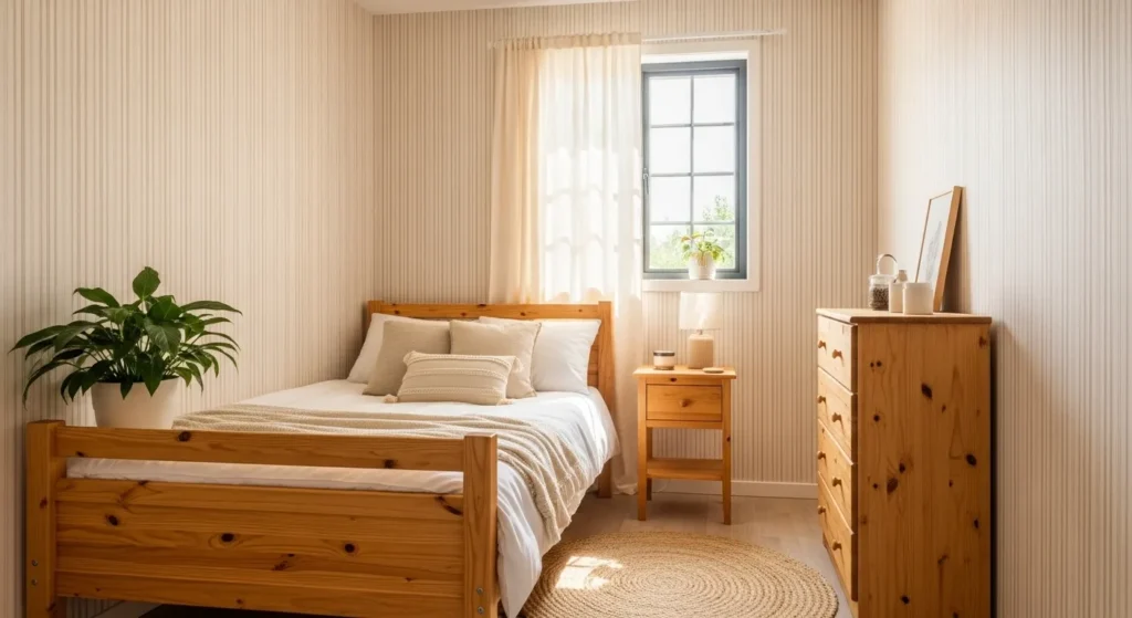 Vertical stripes are a classic wallpaper trick to make small rooms feel taller. The eye naturally follows the lines upward, visually extending ceiling height and giving a sense of openness. Soft, muted colors ensure the pattern doesn’t overwhelm the space while still creating a dynamic effect.