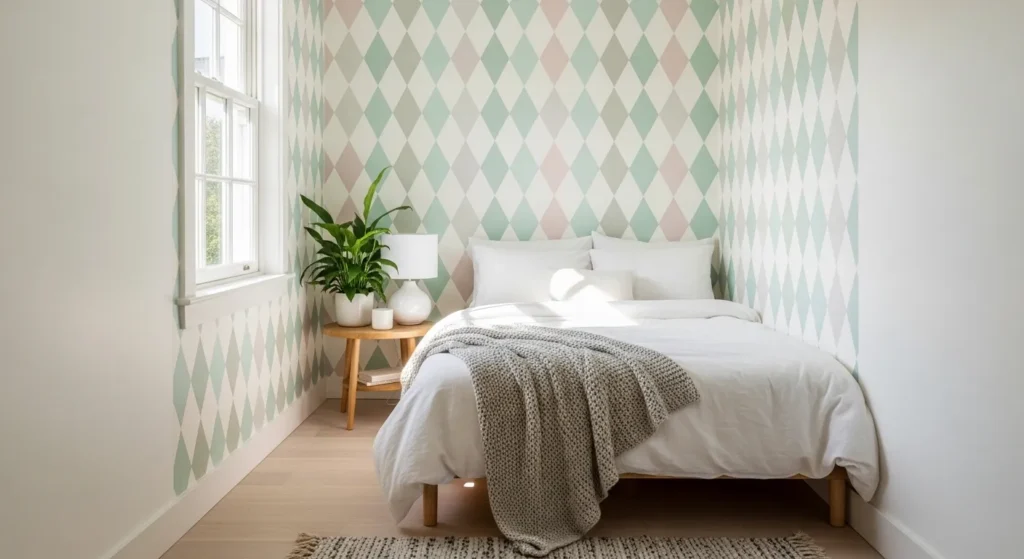 Diamond patterns add dimension by creating an illusion of height and width. The repeated geometric shapes guide the eye along walls, subtly enlarging the perception of the space. Muted colors prevent visual clutter.