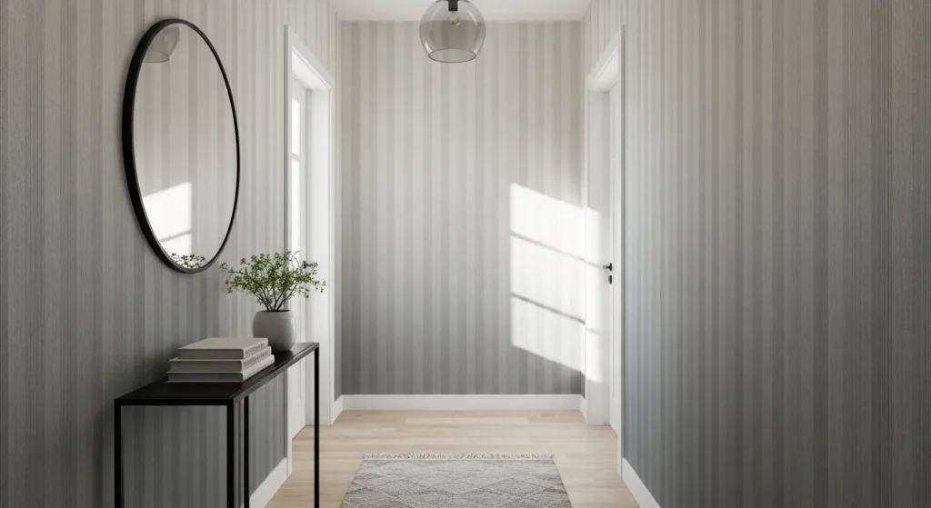 Pair vertical stripes with minimalist furniture and light-colored decor to enhance the illusion of height. Avoid overly bold or wide stripes, which can dominate the room. Subtle contrast between the stripes maintains elegance while helping the space feel elongated, making it ideal for compact bedrooms, home offices, or narrow hallways.