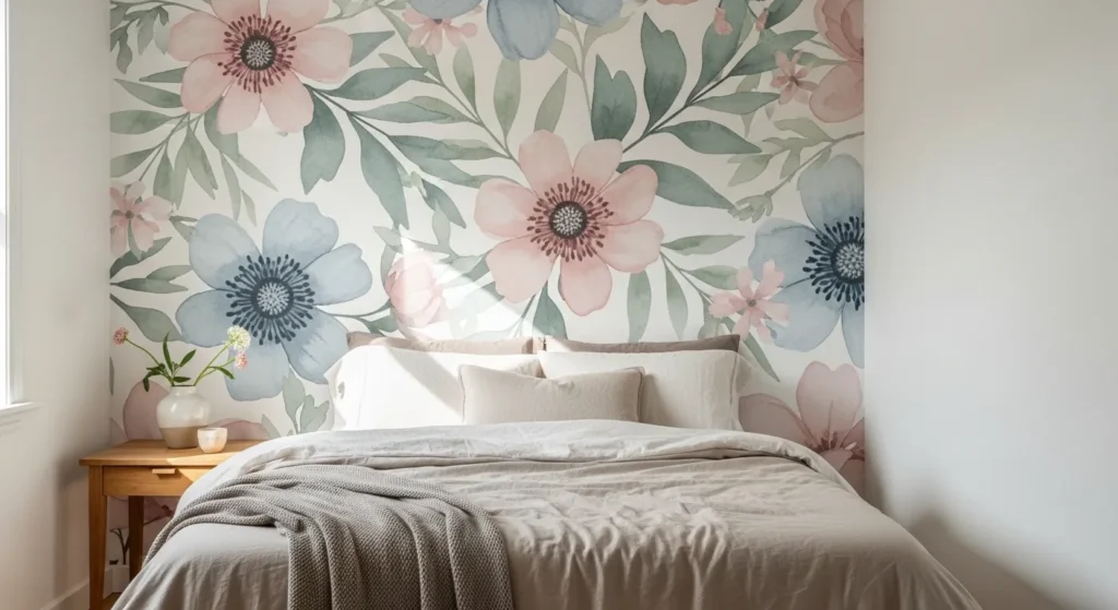 Oversized floral patterns can make a small space feel open if the colors are muted. Large motifs reduce the sense of clutter compared to many tiny prints. Soft pastels and subtle gradients prevent the room from feeling visually busy while still adding personality.