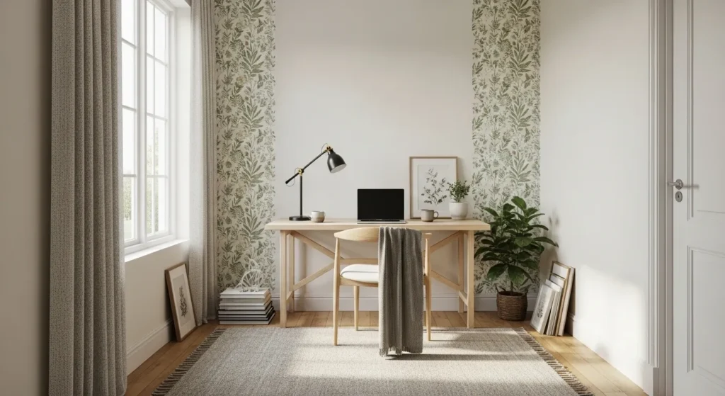 Wallpaper can dramatically change how small rooms feel. Vertical patterns lift ceilings, horizontal or diagonal designs add width, and subtle textures create depth.