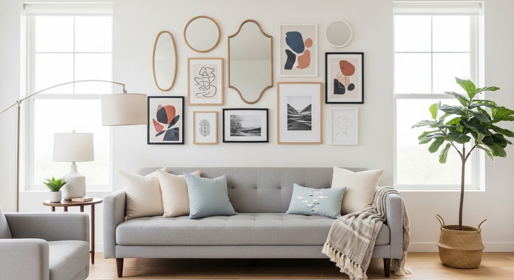 Arranging reflective pieces strategically prevents glare while enhancing depth. Repeating frame finishes ties everything together. The result is a gallery wall that feels luminous and layered, transforming the seating area into a stylish focal feature.