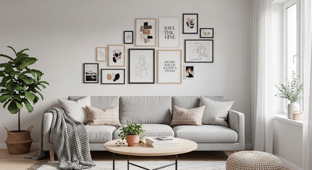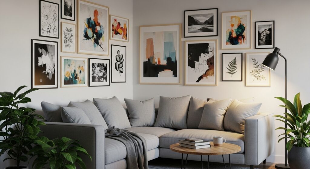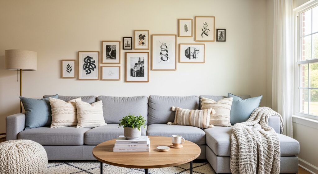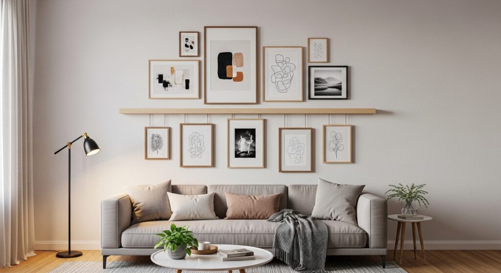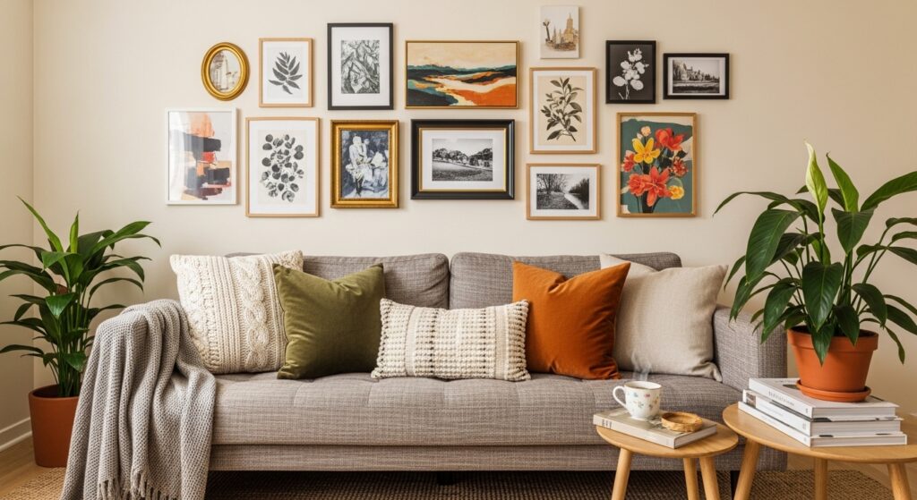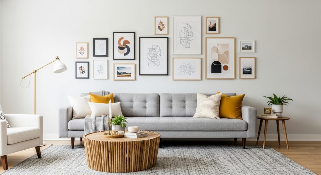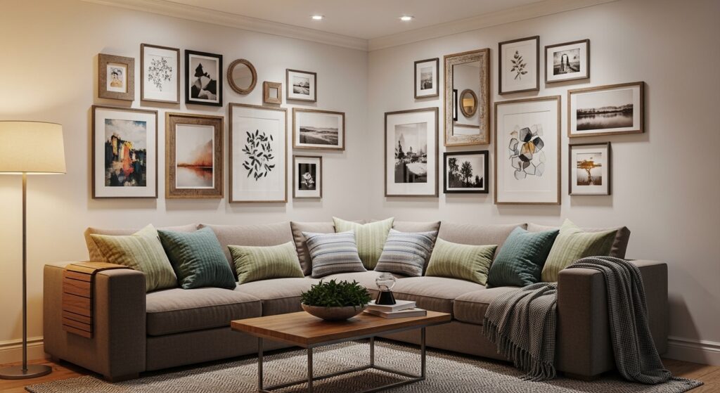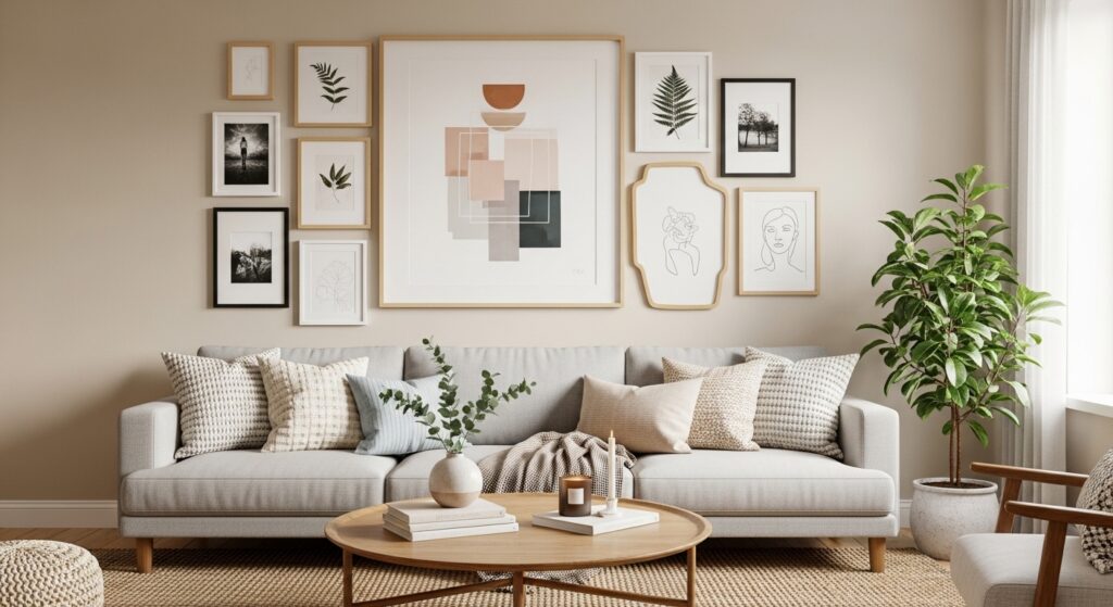 Maintaining consistent spacing prevents visual chaos. Decorative accents echo colors found in the artwork, tying everything together. The result is a dynamic gallery wall that feels curated and adaptable, transforming the sofa area into a styled vignette.