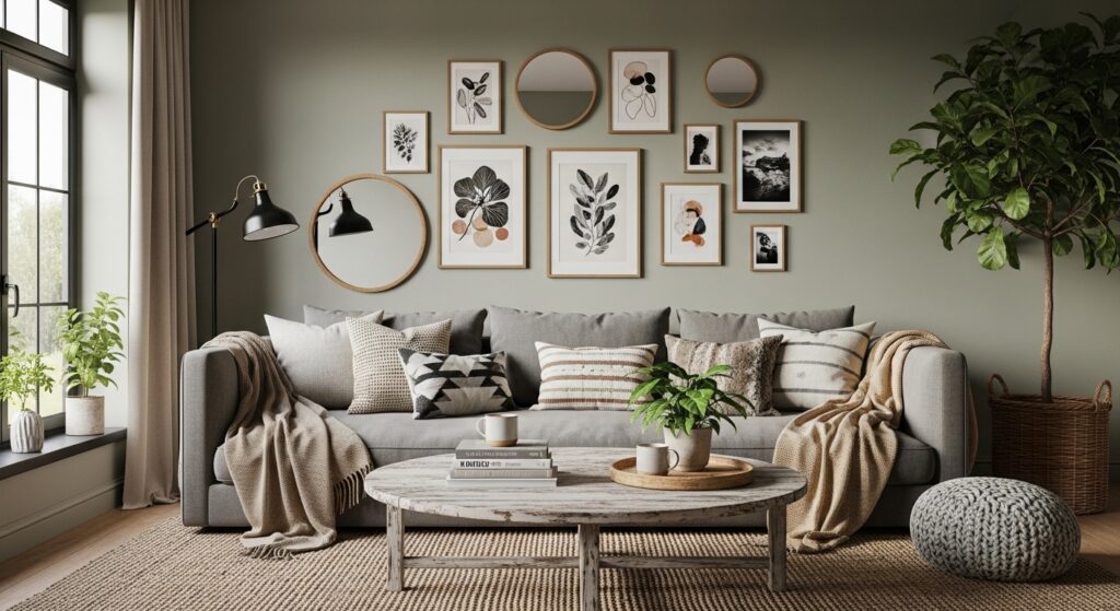 Repeating colors or textures prevents the arrangement from feeling random. Starting with larger anchors helps guide placement. The result is a gallery wall full of personality that transforms the seating area into an engaging visual story.