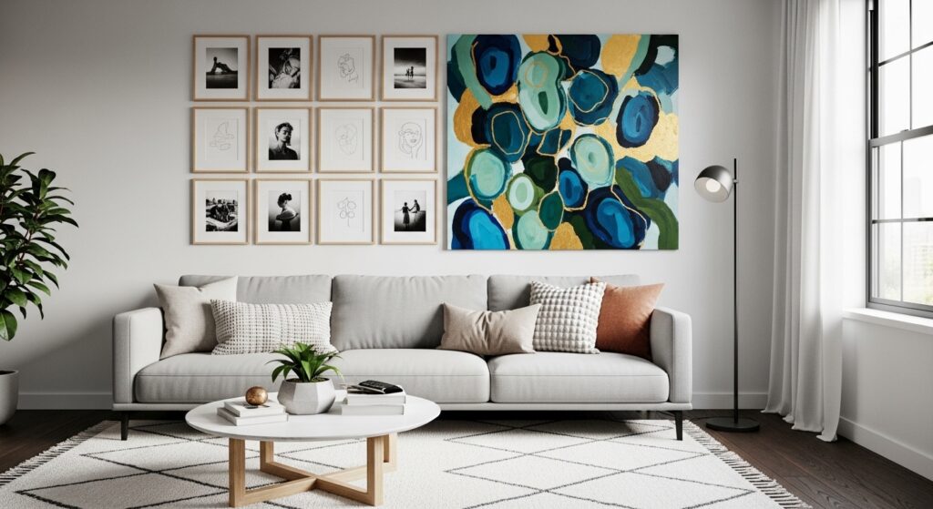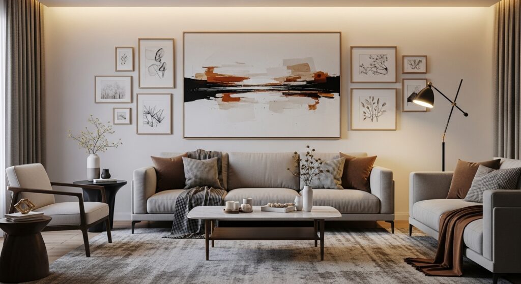 Balancing visual weight is essential — larger pieces ground the heavier side. Cohesive framing keeps the arrangement unified. The result is a gallery wall that feels modern and expressive, adding creative tension to the seating area.