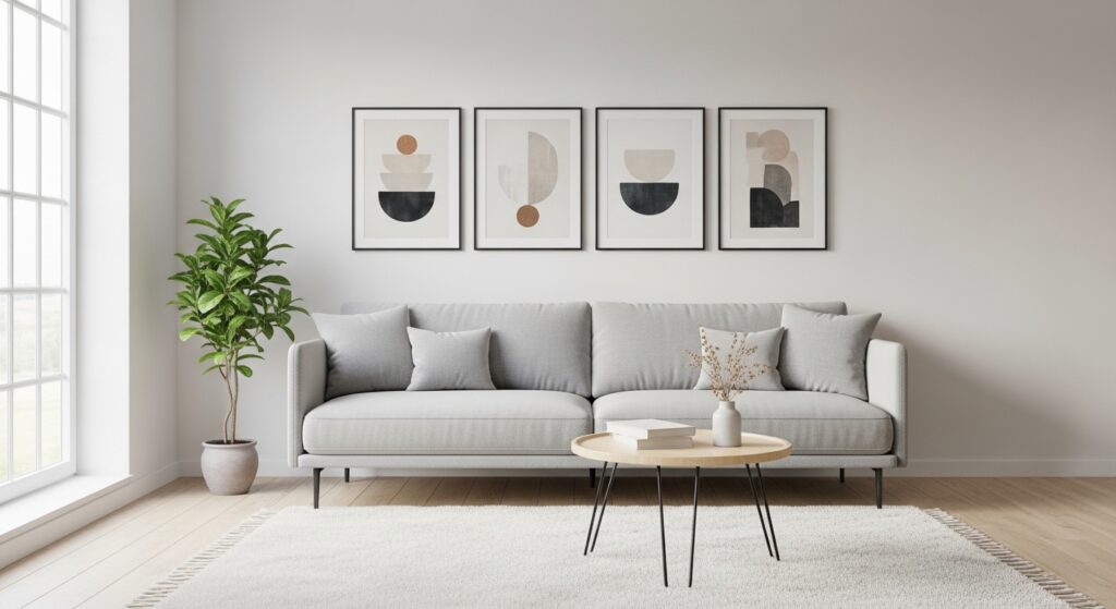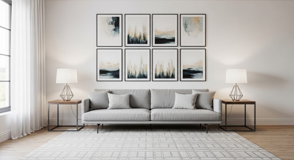 A symmetrical grid layout creates an instantly polished look above the sofa. Evenly spaced frames form a clean rectangle that feels intentional and calming. This structure works beautifully in modern or minimalist living rooms where balance is key. The repetition allows artwork to shine without overwhelming the wall, making the space feel organized and visually grounded. Because the layout is predictable, the eye reads it as harmony, which naturally complements the horizontal line of the sofa.
