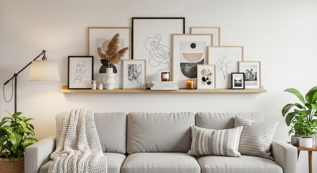 Layering different sizes adds visual interest while maintaining structure along the ledge. Decorative accents like small plants or objects enhance the composition. The result is a gallery wall that feels adaptable and cozy, turning the sofa backdrop into a living display.