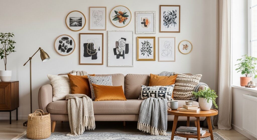 Cohesive color themes keep the wall unified. Larger circular frames can anchor the layout while smaller rectangles fill gaps. The result is a gallery wall that feels layered, engaging, and visually balanced above the sofa.