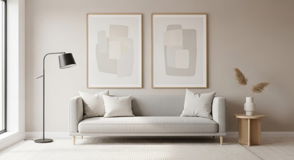 Sometimes simplicity creates the strongest impact. A two-piece layout places matching or complementary frames above the sofa, offering balance without clutter. This approach allows artwork to breathe while maintaining a focal presence. It’s ideal for minimalist interiors where restraint enhances sophistication.