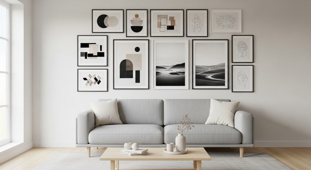 Consistent spacing keeps the arrangement crisp and intentional. Neutral palettes maintain calm while allowing artwork to stand out. The result is a gallery wall that enhances vertical space and adds elegant structure to the room.