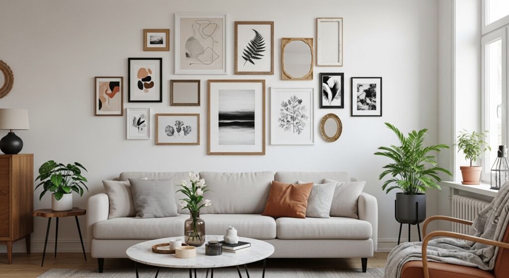 Repeating colors or themes throughout the frames ties the composition together. Accent objects like small plants or vases enhance the display without overpowering the artwork. The result is a gallery wall that is adaptable, visually interesting, and effortless to update over time.